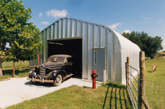 アーチ型スチールビルドの歴史は長く、1900年代初頭にイギリスで製造された産業が始まりといわれる。当時の製品に波型はなく極めてシンプルな平鋼鈑仕様であった。1940年代にドイツの開発者、William F.Drewが波型鋼鈑を利用した特許技術を取得し、間もなくアーチ型スチールビルドは、米国人の実業家によってアメリカに持ち込まれた。この製品は耐候性や強度、極めてシンプルな施工手順により瞬く間に人気を博し、アメリカでも本格的にアーチ型スチールビルドが普及・定着し始めた。
